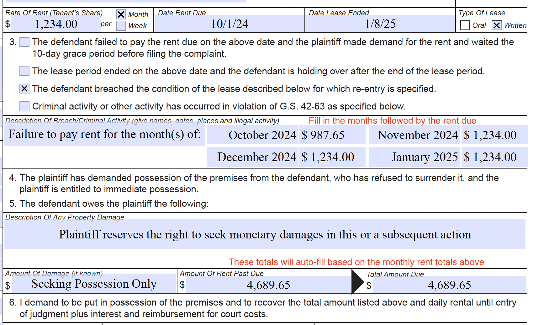 NEW: The Amount of Rent Past Due will autofill based on the amounts of rent written out in Description of Breach.